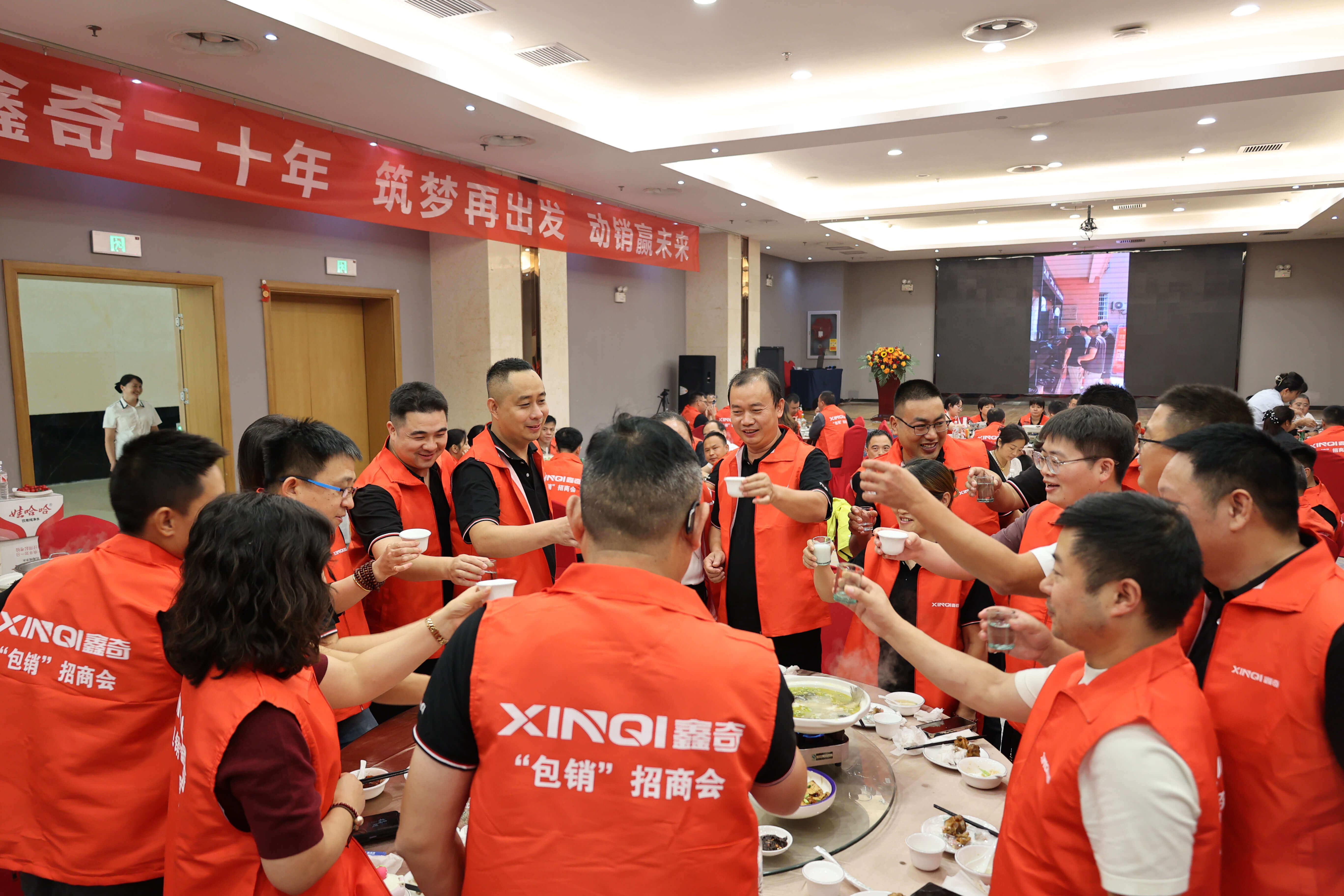 随后,付董事长携各营销精英,一同向现场嘉宾伙伴举杯祝酒,共庆荣耀时刻,共贺鑫奇二十周年生日快乐,共祝鑫奇创造更加美好的未来!